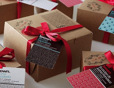 from rianna williams’ site. “Brown is a small confectioner’s shop in Bogotá that’s always used kraft board boxes to pack their products. They wanted a new corporate image and a simple and low budget solution to identify what’s inside them. Bogotá, Colombia design firm Lip Ltda came up with a series of cards and stamps that carry the information simply and succinctly.”